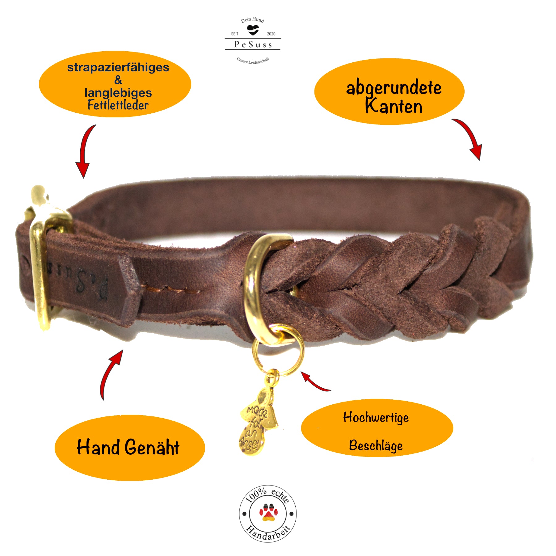 - Rundgelegte Kanten & weiches Fettleder macht unser Halsband besonders fellschonend und geschmeidig.
